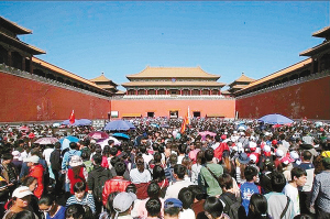 故宮,三大殿擠得看不到地面:售票窗口前排著蜿蜒的長隊,三大殿所在的故宮中軸線上,游客多得看不到地面。
